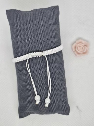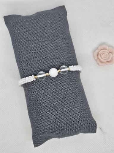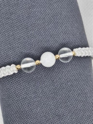 Macramé náramek bílé barvy s přírodním minerálem Křišťál a Jadeit bílý . Minerály jsou velké 0,8 cm a 0,6 cm . Kovové korálky jsou chirurgická ocel zlacená vel. 0,3 cm.