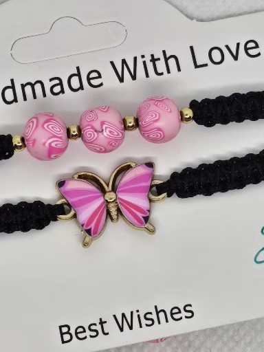 Sada 2 ks macramé náramků černé barvy . Růžový motýlek je kov , ostatní komponenty jsou plast . Délka náramků bez upevňovací části je 15 cm .