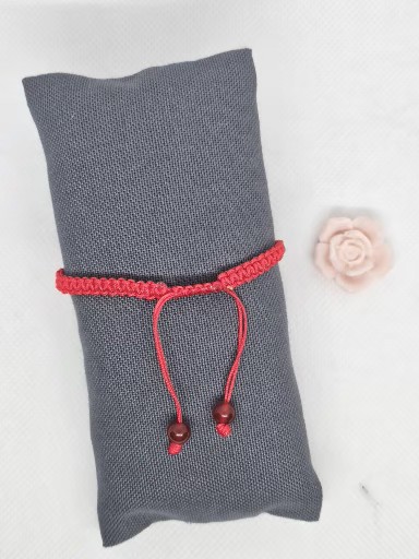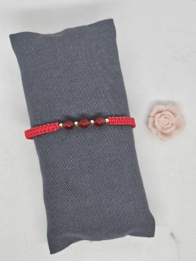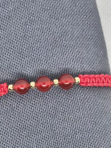 Macramé náramek červené barvy s přírodním Karneolem . Kovové korálky jsou stříbro AG925/1000 zlacené zlatem 24K . Délka náramku bez upevňovací části je 15 cm .