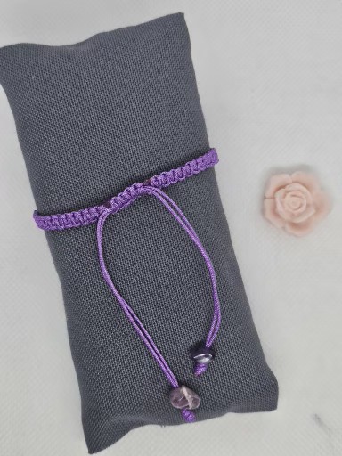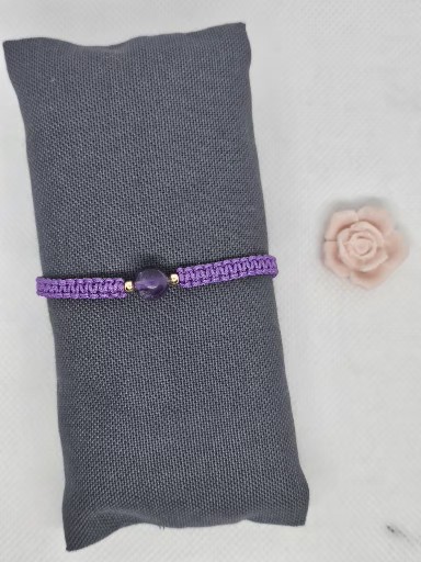 Macramé náramek fialové barvy s přírodním Ametystem . Kovové korálky jsou chirurgická ocel zlacená . Délka náramku bez upevňovací části je 15 cm .
