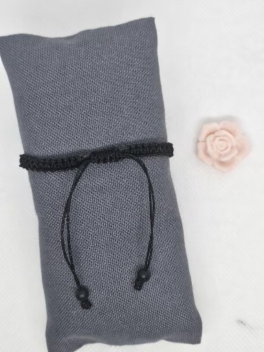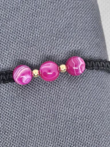 Macramé náramek černé barvy s přírodními minerály Achát růžový pruhovaný a Láva . Kovové korálky jsou stříbro AG925/1000 , zlacené zlatem 24K . Délka náramku bez upevňovací části je 15 cm .