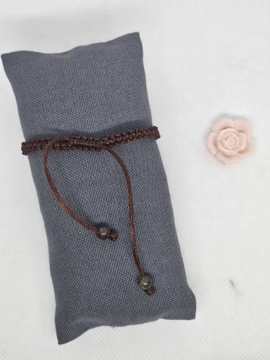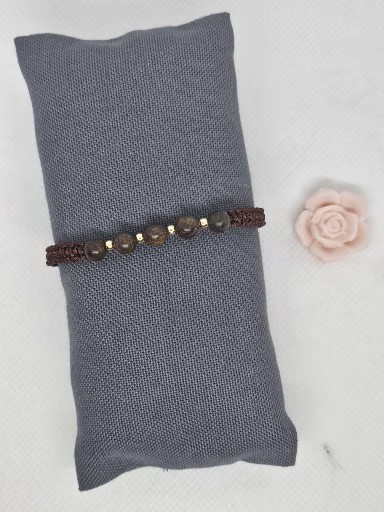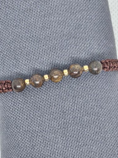 Macramé náramek hnědé barvy s přírodním minerálem Bronzit . Kovové korálky jsou chirurgická ocel zlacená . Délka náramku bez upevňovací části je 15 cm .