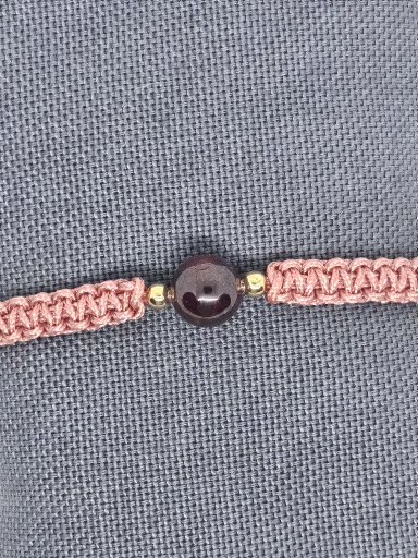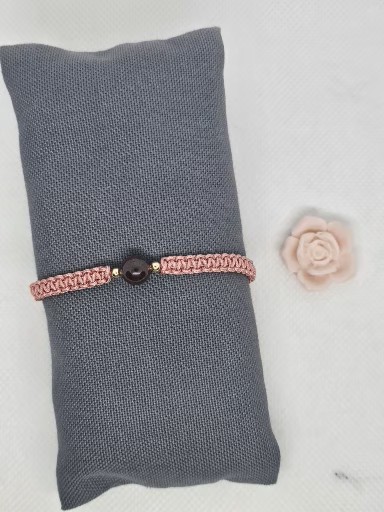 Macramé náramek starorůžové barvy s přírodním minerálem Granát . Kovové korálky jsou chirurgická ocel zlacená . Délka náramku bez upevňovací části je 15 cm .