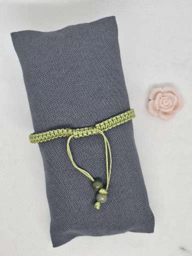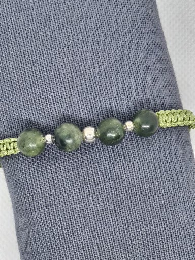 Macramé náramek zelené barvy s přírodním minerálem Jadeit Čínský . Kovové korálky jsou stříbro AG925/1000 .