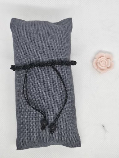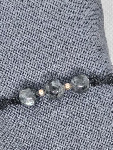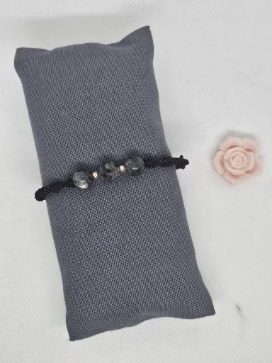 Macramé náramek černé barvy s přírodními minerály Labradorit 0,8 cm a Láva 0,6 cm . Délka náramku bez upevňovací části je 15 cm . Kovové korálky jsou chirurgická ocel zlacená 0,3 cm .