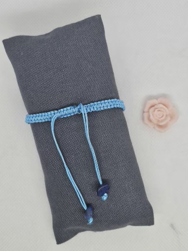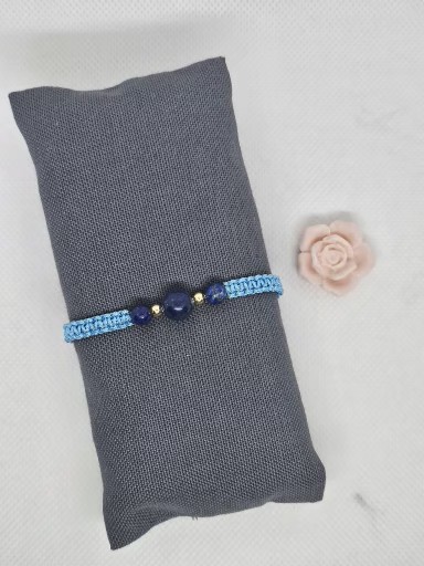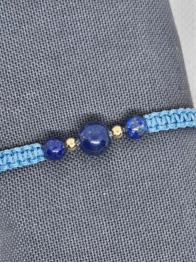 Macramé náramek modré barvy s přírodním minerálem Lapis Lazuri . Kovové korálky jsou stříbro AG925/1000 , zlacené zlatem 24K. Délka náramku bez upevňovací části je 15 cm .