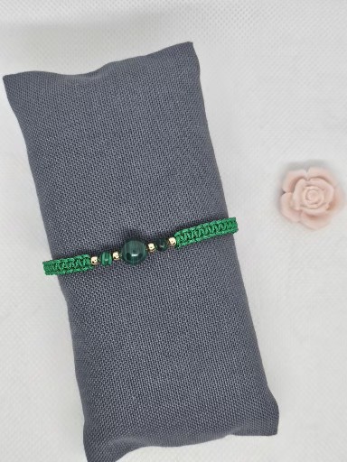 Macramé náramek zelené barvy s přírodním Malachitem . Kovové korálky jsou chirurgická ocel zlacená .