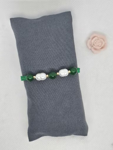 Macramé náramek zelené barvy s přírodním minerálem Jadeit Malaisia a s perlou říční . Kovové korálky jsou chir. ocel zlacená .