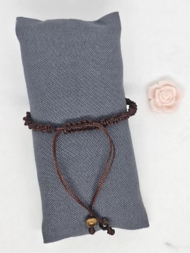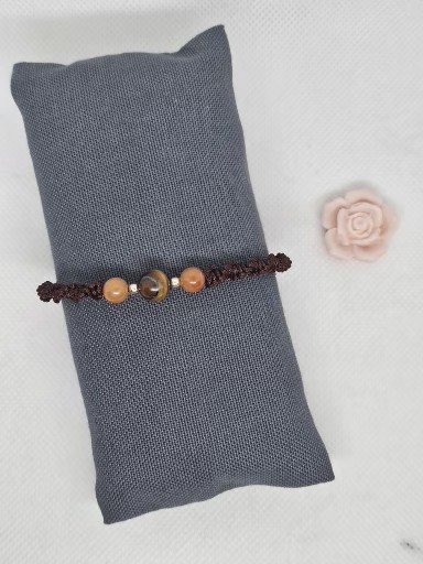 Macramé náramek hnědé barvy s přírodním minerálem Tygří oko a přírodní Topaz . Kovové korálky jsou stříbro AG925/1000 .