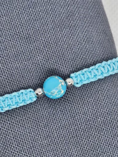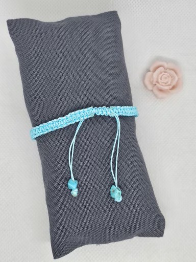 Macramé náramek modré barvy s přírodním Tyrkenitem . Kovové korálky jsou stříbro AG925/1000 .