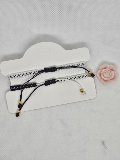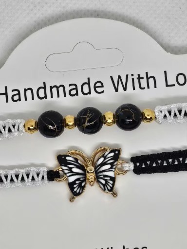 Sada 2 ks macramé náramků v kombinaci černé a bílé barvy . Délka náramků bez upevňovací části je 15 cm . Motýlek je kovový , ostatní komponenty jsou plast .