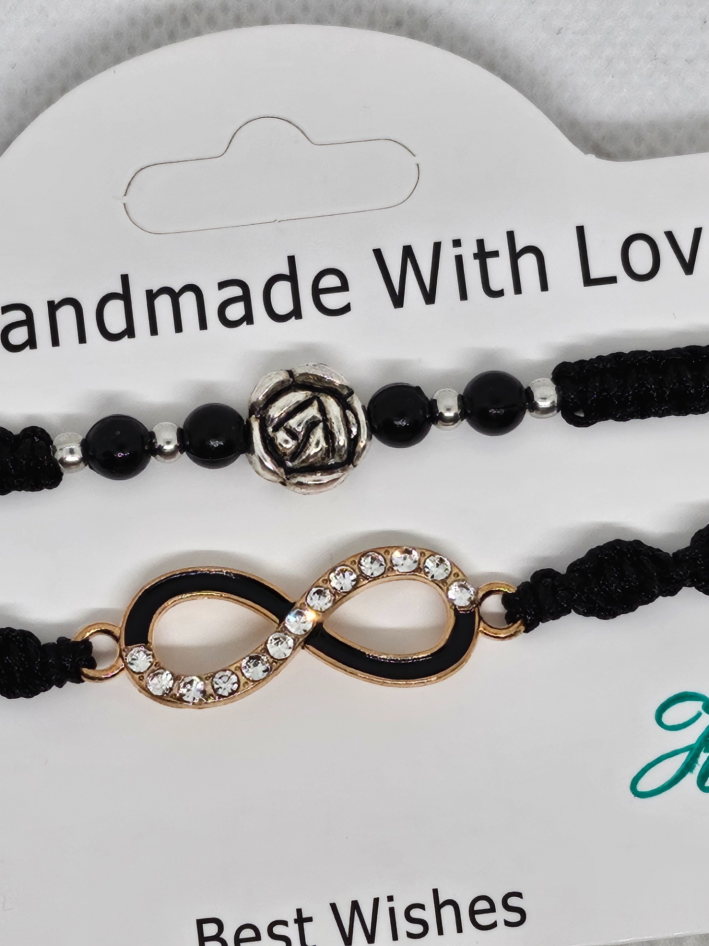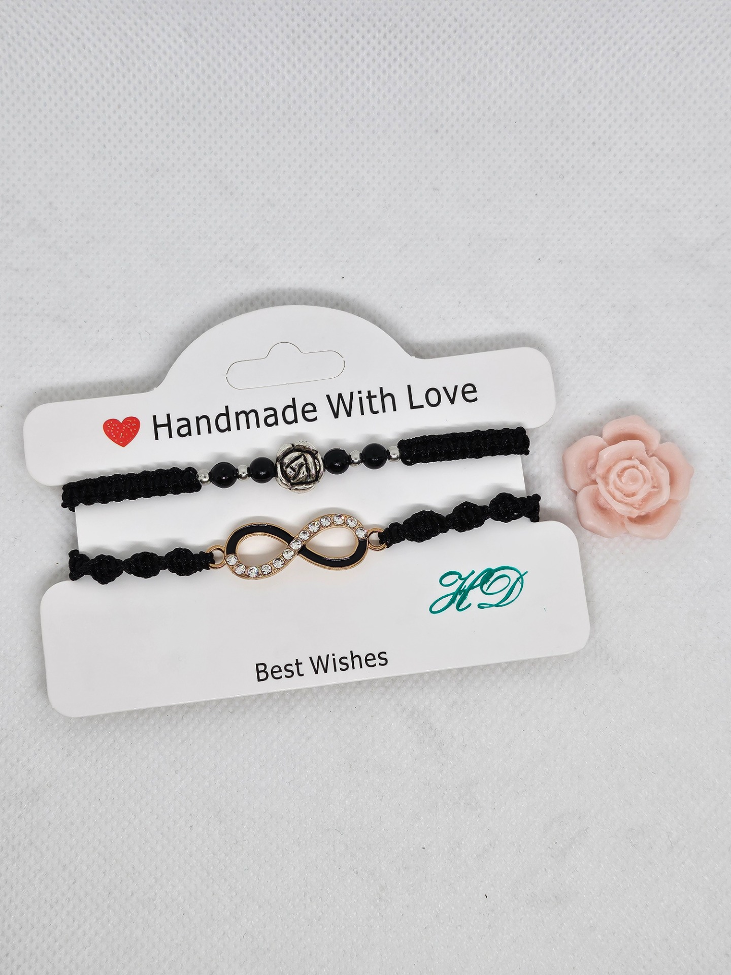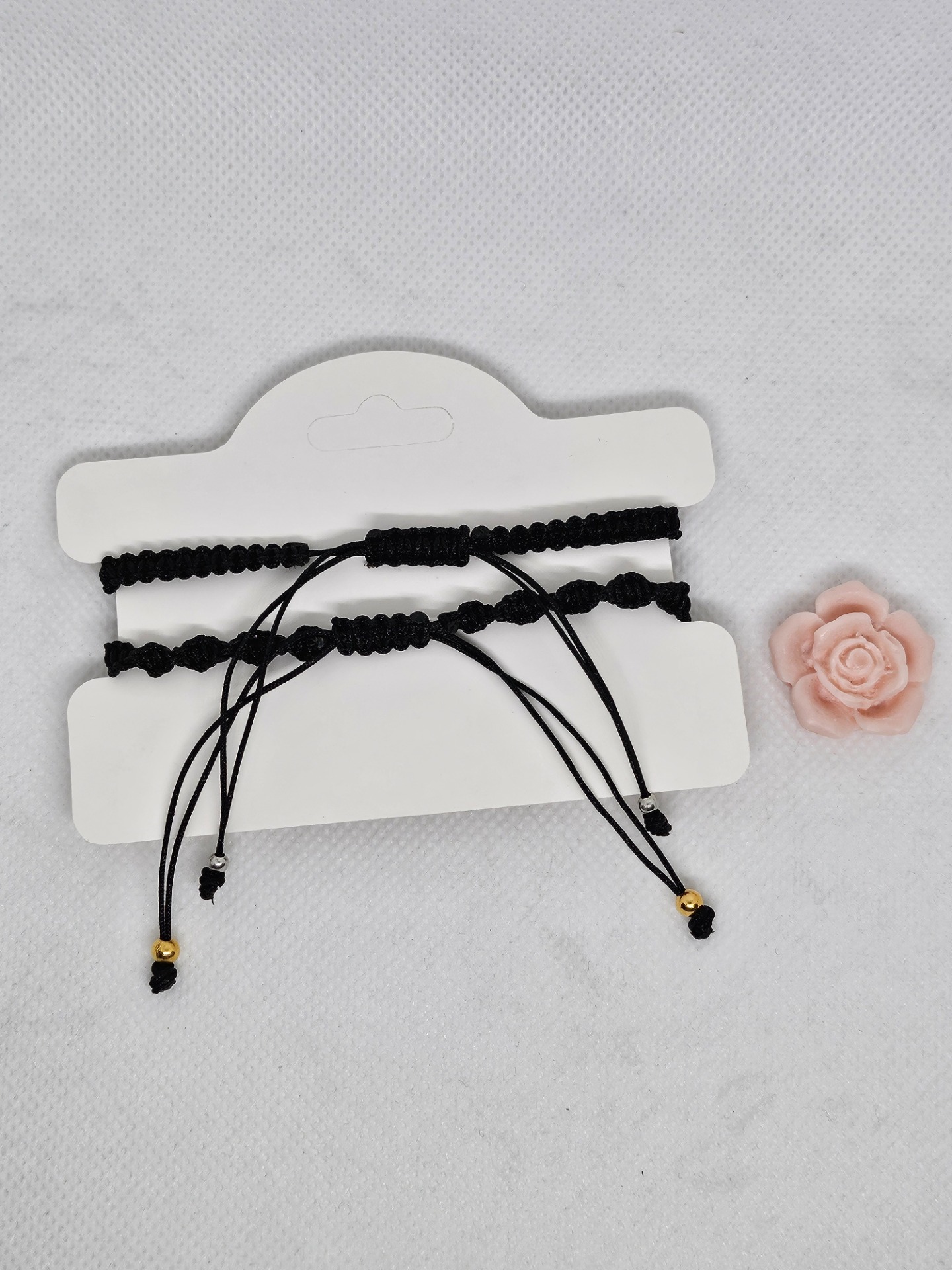 Náramky macramé černé barvy . Délka náramků je 15 cm bez upevňovací části . Nekonečno a růže jsou kovové , korálky plast .