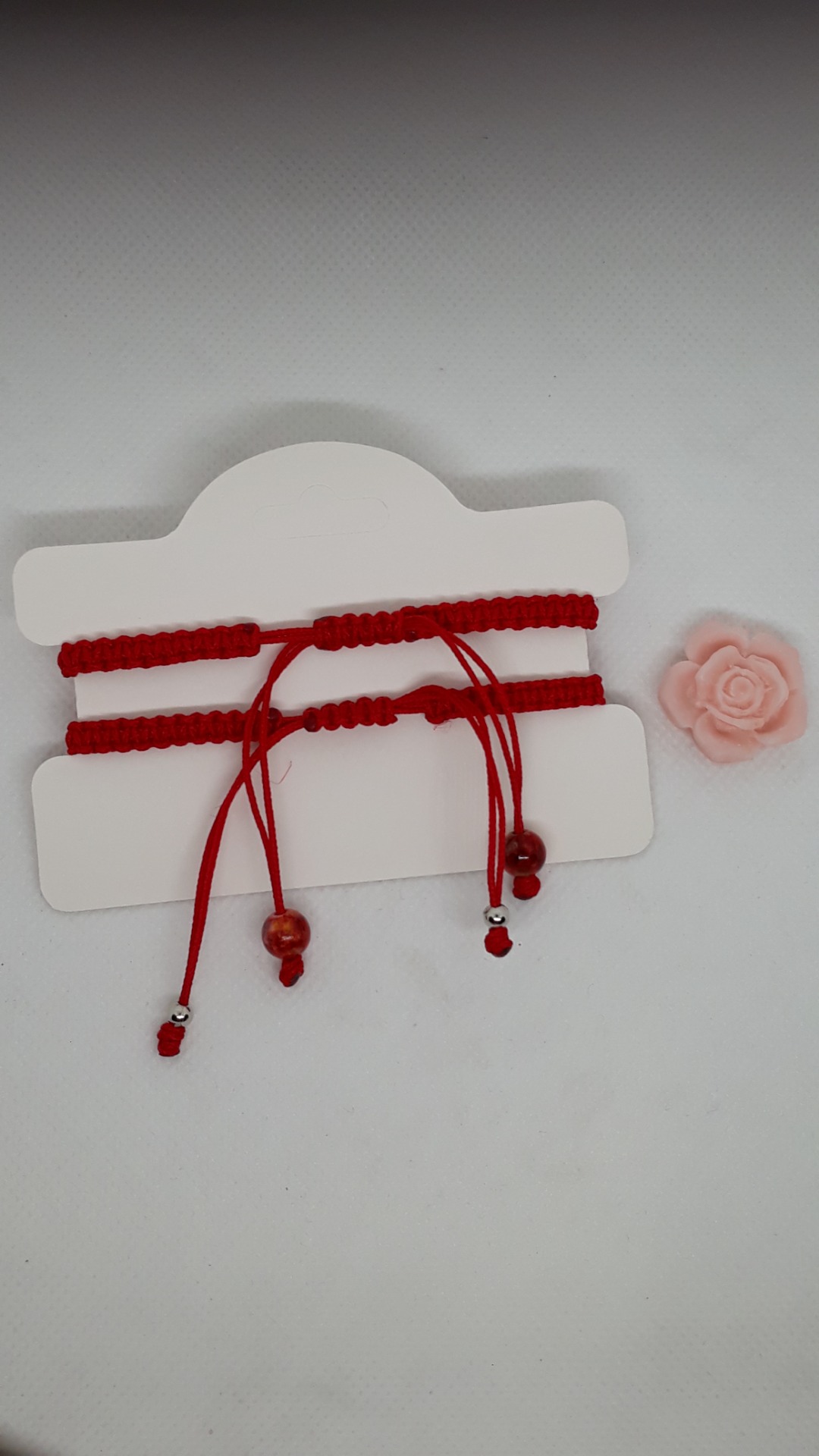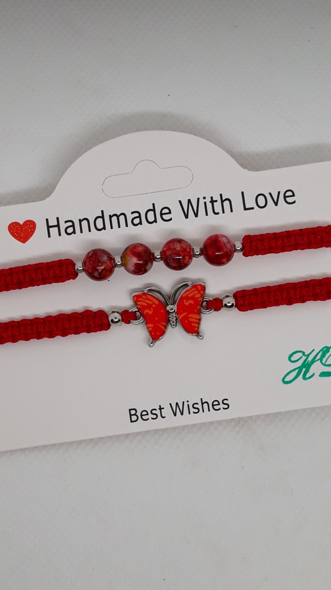 Náramky macramé červené barvy . Délka náramků je 15 cm bez upevňovací části . Motýl je kovový , korálky plast .
