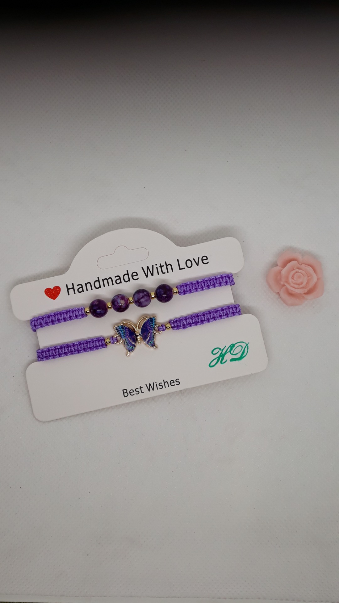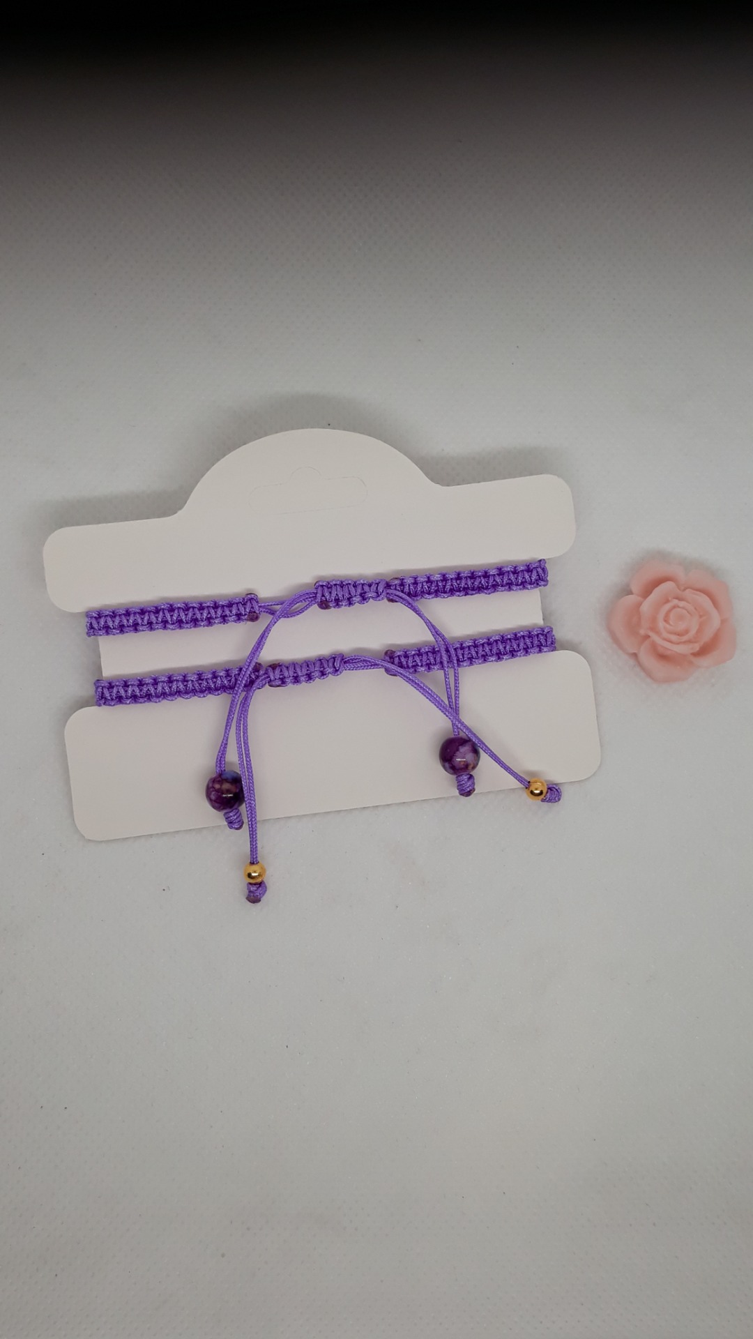 Náramky macramé fialové barvy . Délka náramku je 15 cm bez upevňovací části . Přívěsek je kovový , fialové korálky plast .