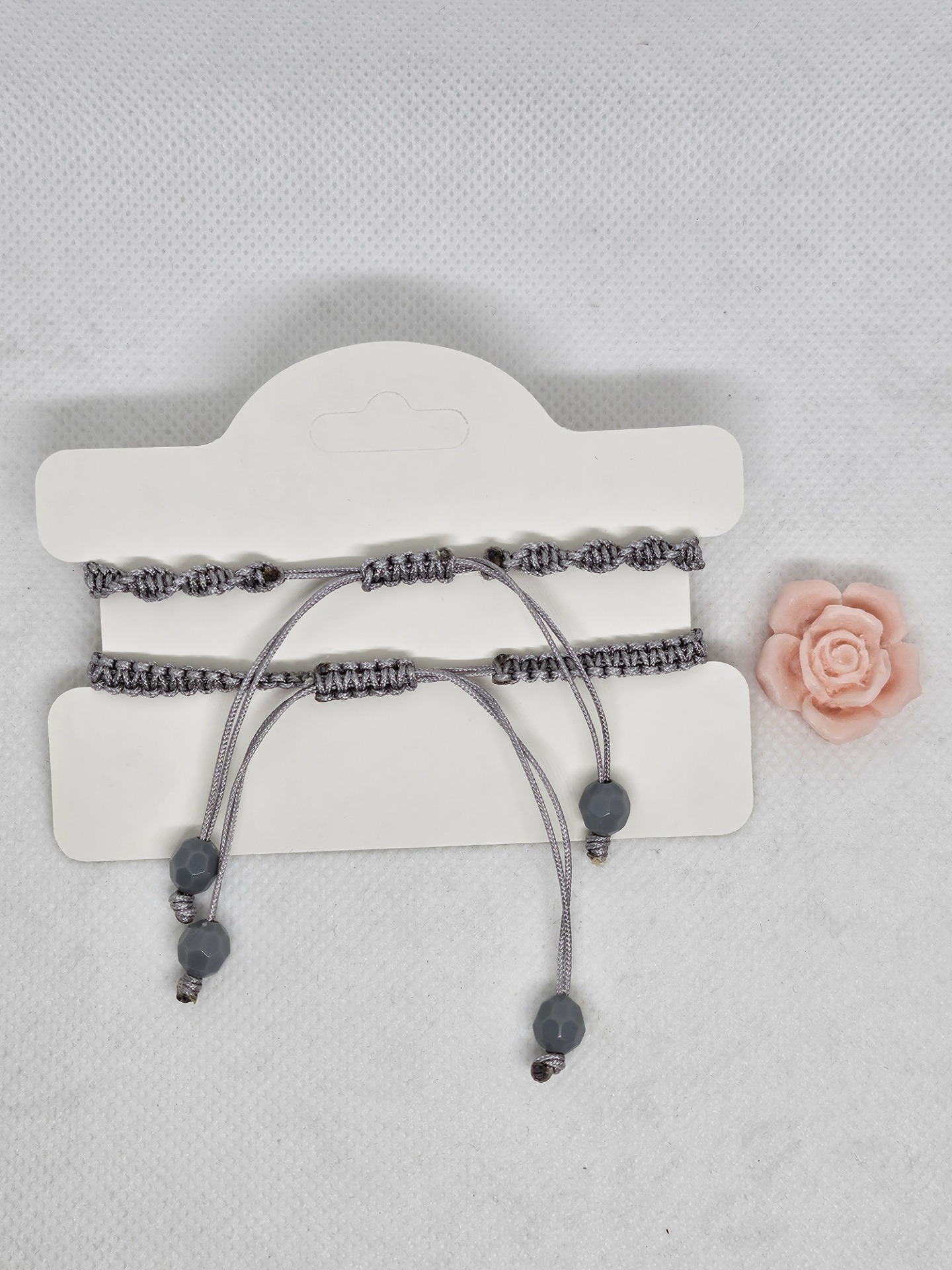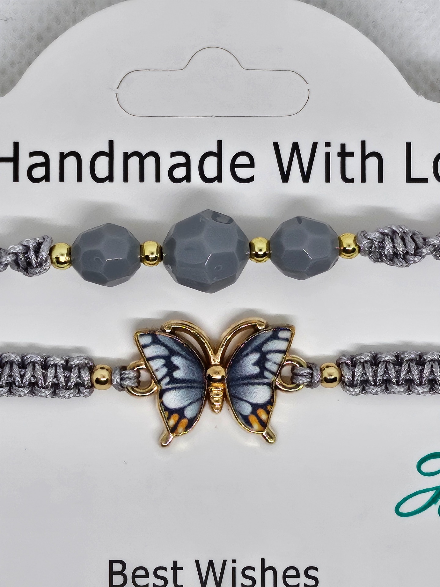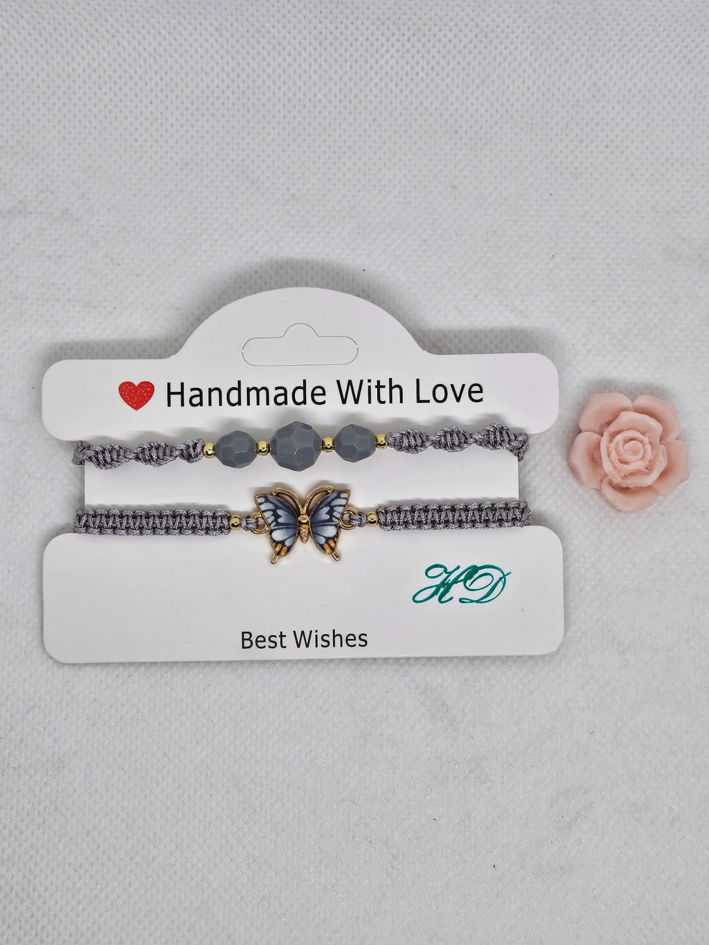 Náramky macramé šedé barvy . Délka náramků je 15 cm bez upevňovací části . Motýl je kovový , korálky plast .