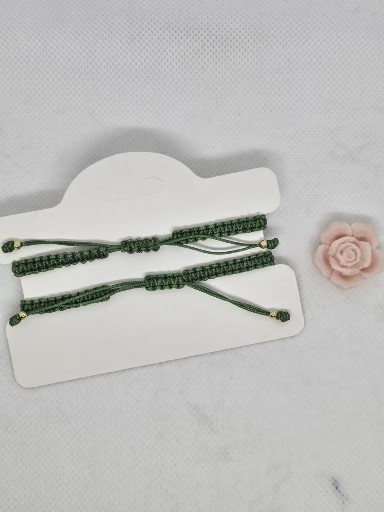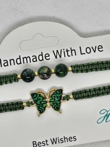 Sada 2 ks náramků macramé zelené barvy . Motýlek je kovový , ostatní komponenty jsou plast . Délka náramků bez upevňovací části je 15 cm .