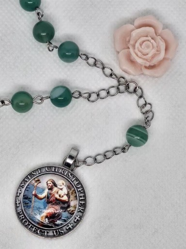 Přívěsek do auta se svatým Kryštofem z přírodního minerálu Achát zelený pruhovaný . Kovové části jsou chirurgická ocel 316L . Přívěsek svatého Kryštofa je bižuterie . Průměr přívěsku je 2,5 cm .