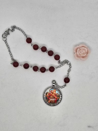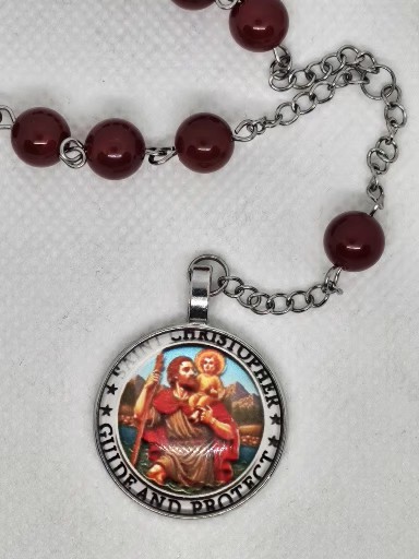 Přívěsek do auta se svatým Kryštofem . Korálky jsou z přírodního minerálu Karneol , průměr 0,8 cm . Kovové části jsou nerez a přívěsek svatého Kryštofa je bižuterie . Karneol je kamenem vitality a životní energie .
