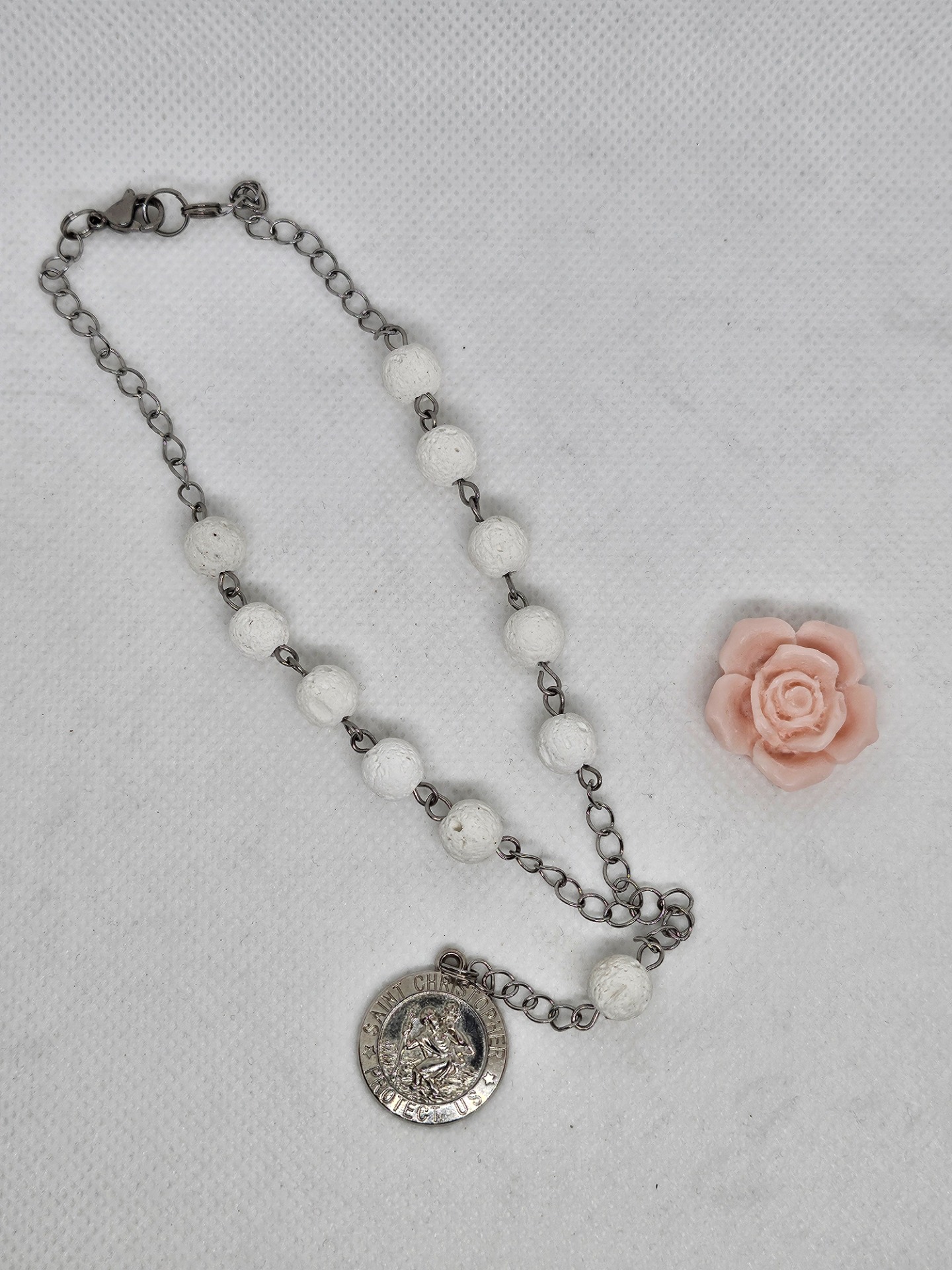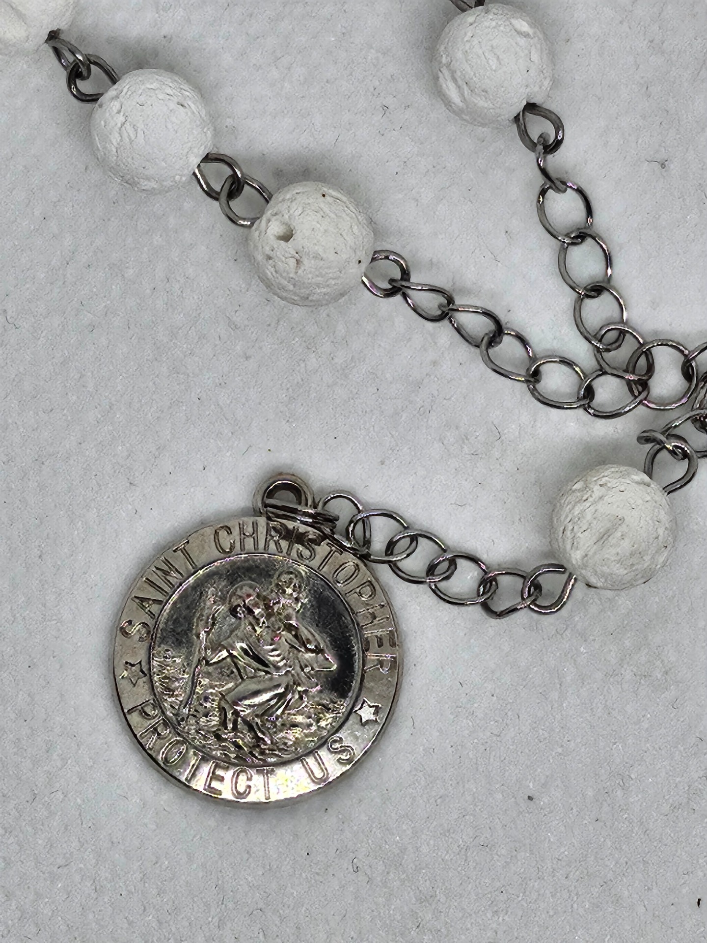 Přívěsek do auta se svatým Kryštofem . Korálky jsou přírodní bílá láva . Přívěsek je bižuterie , kovové části jsou chirurgická ocel 316L .