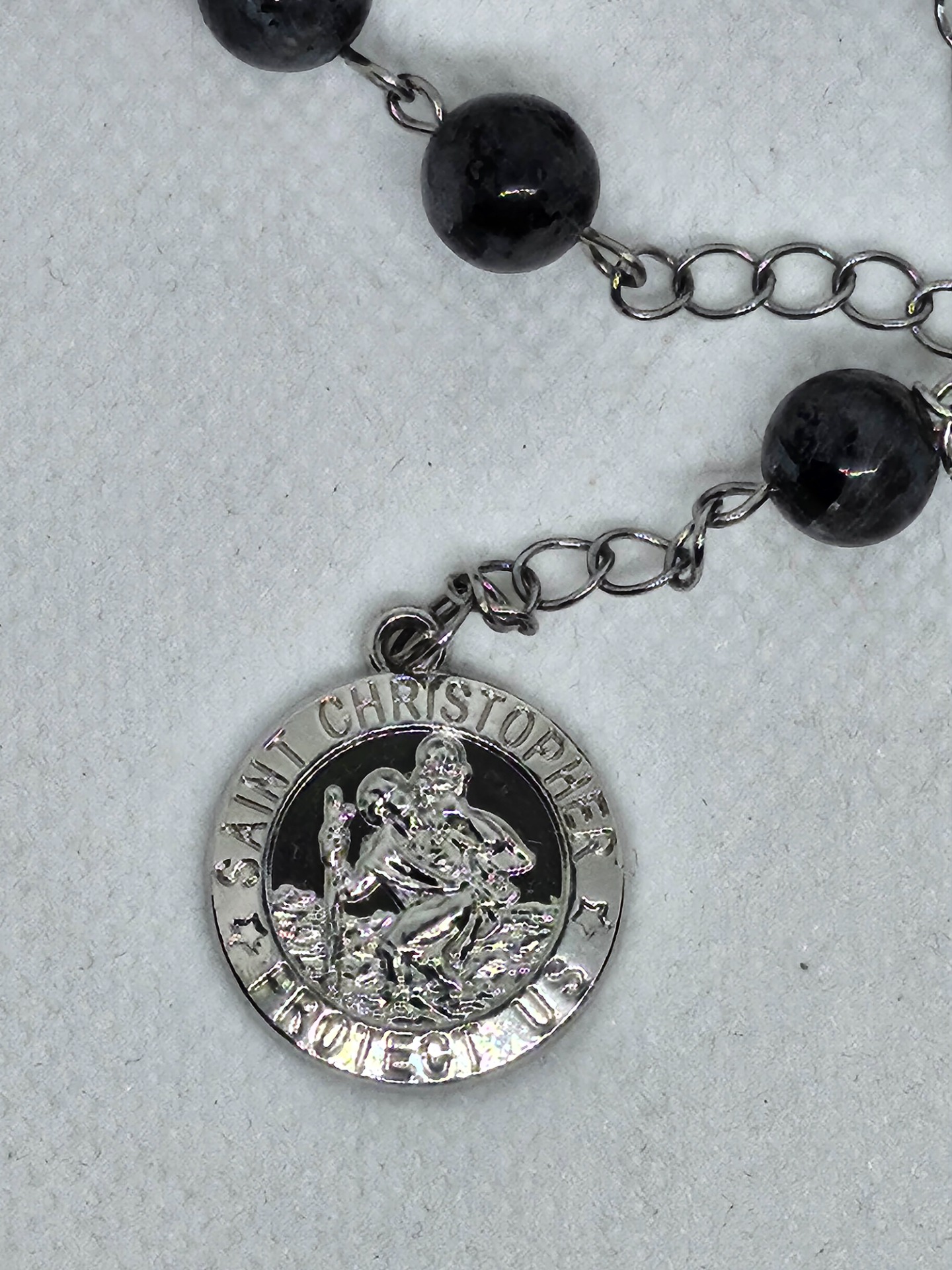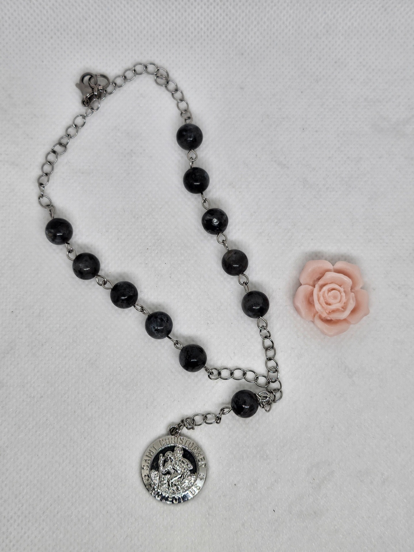 Přívěsek do auta se svatým Kryštofem . Korálky jsou z přírodního minerálu Labradorit . Přívěsek se svatým Kryštofem je bižuterie , kovové části jsou chirurgická ocel 316L .