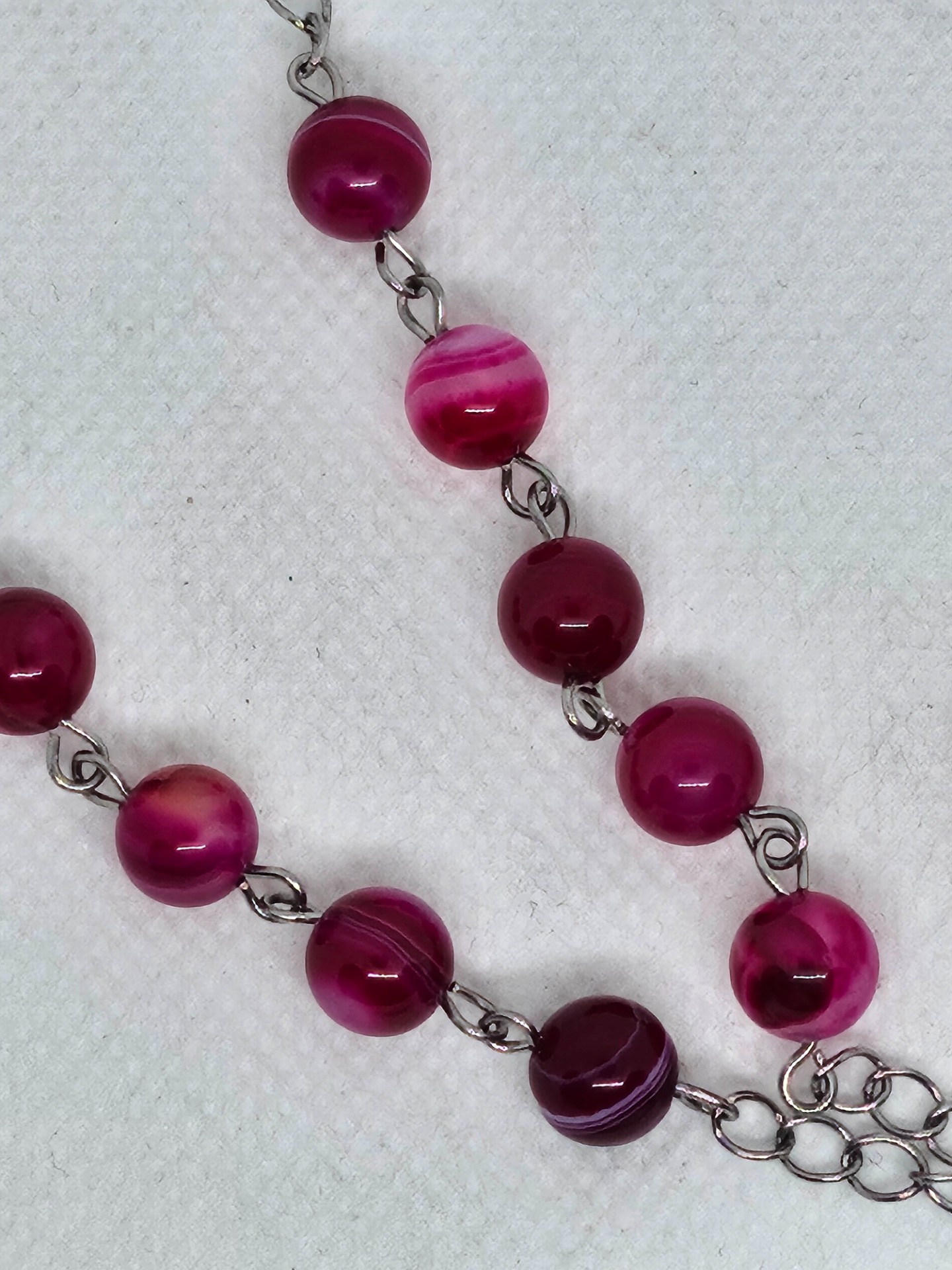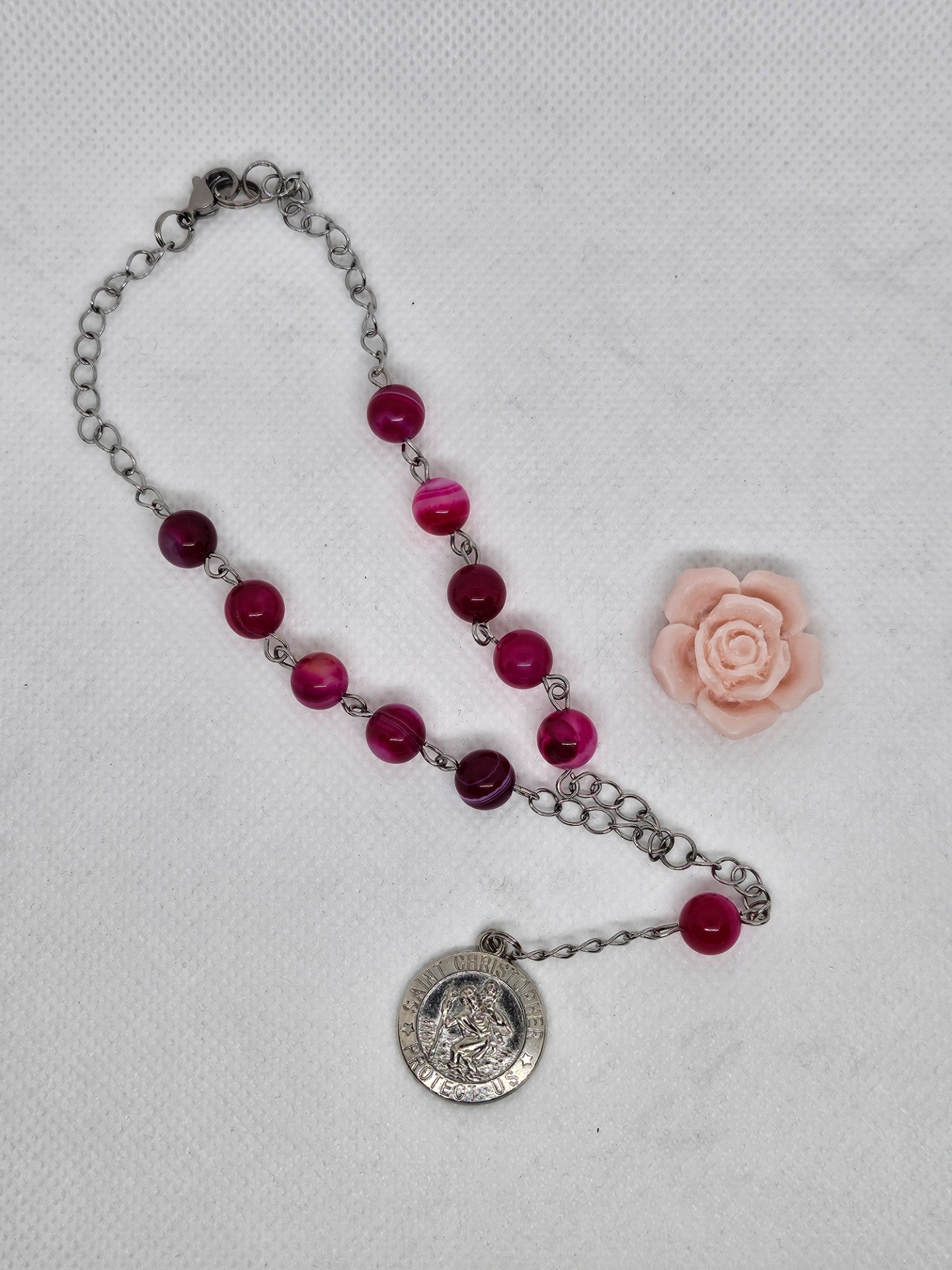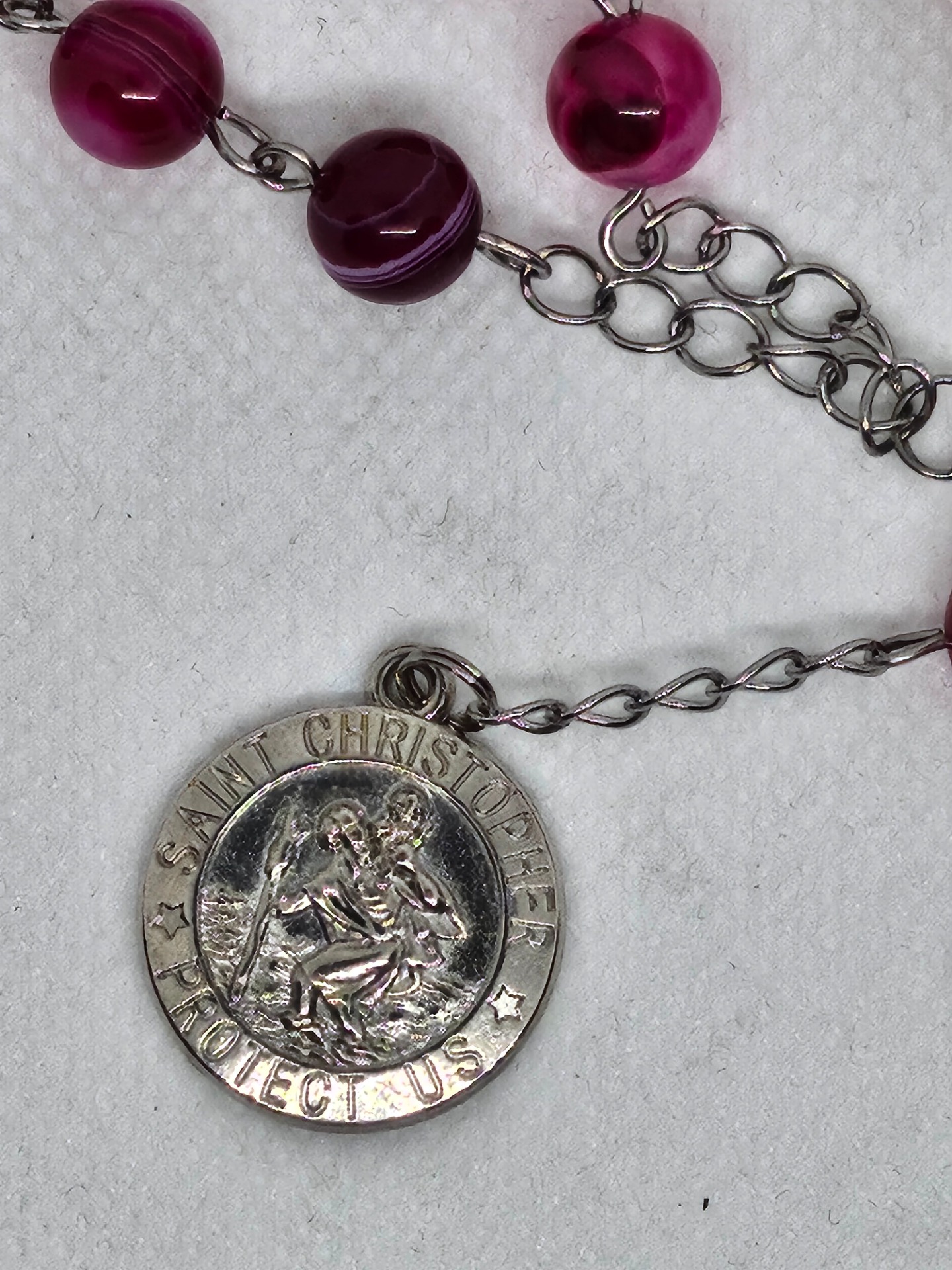 Růženec do auta z přírodního minerálu Achát růžový pruhovaný . Přívěsek se svatým Kryštofem . Přívěsek je bižuterie , kovové části jsou chirurgická ocel 316L.