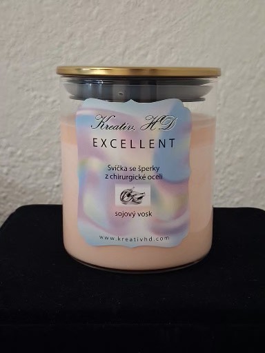 Sojová svíčka ve skle o objemu vosku 300 ml . Svíčka je navoněná esencemi . Ve vosku jsou ukryté náušnice z chirurgické oceli 316L . V každé svíčce jsou jiné . Barva vosku i tvar náušnic je náhodná . Krásný dárek s překvapením .