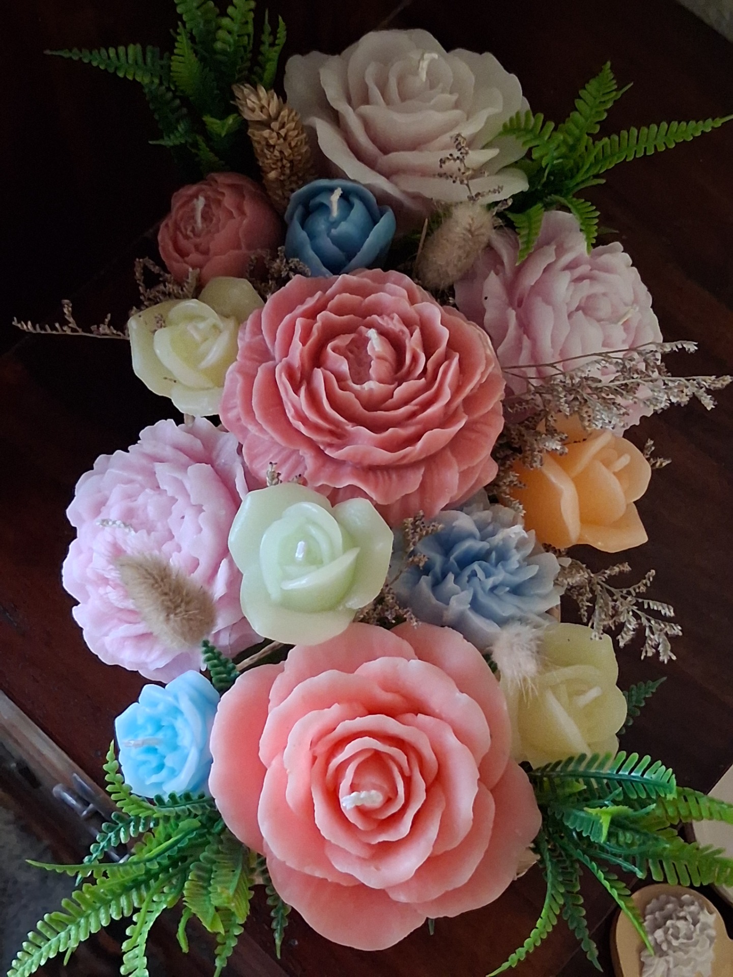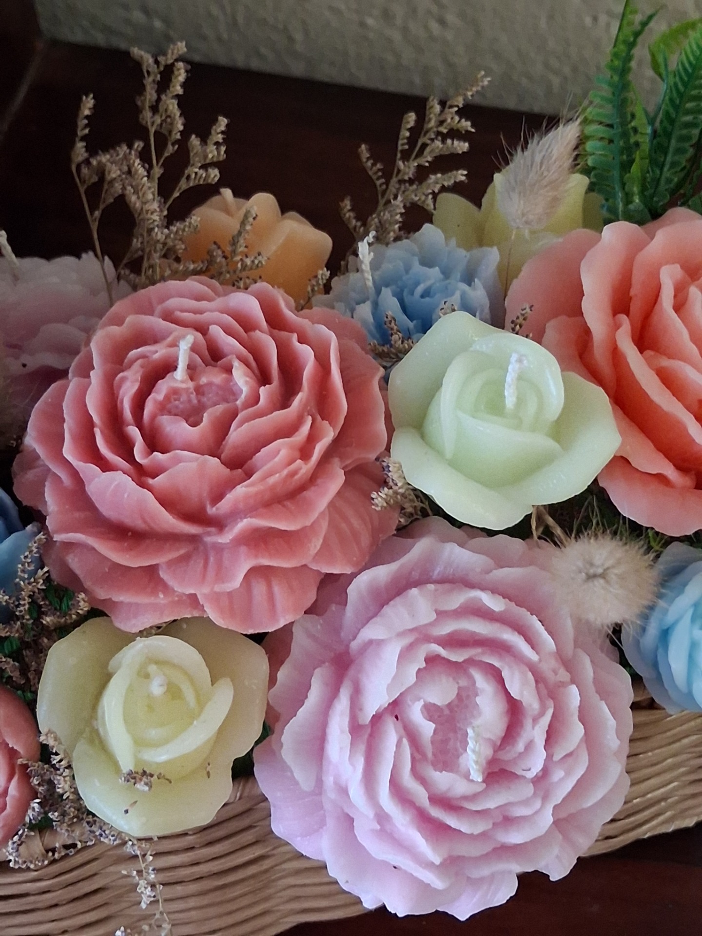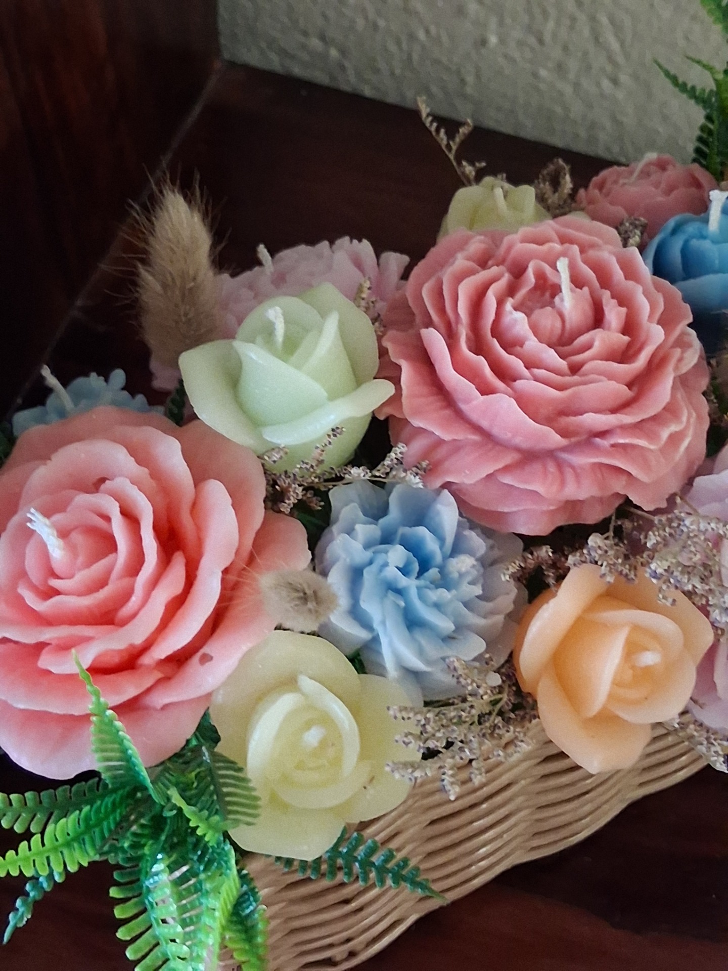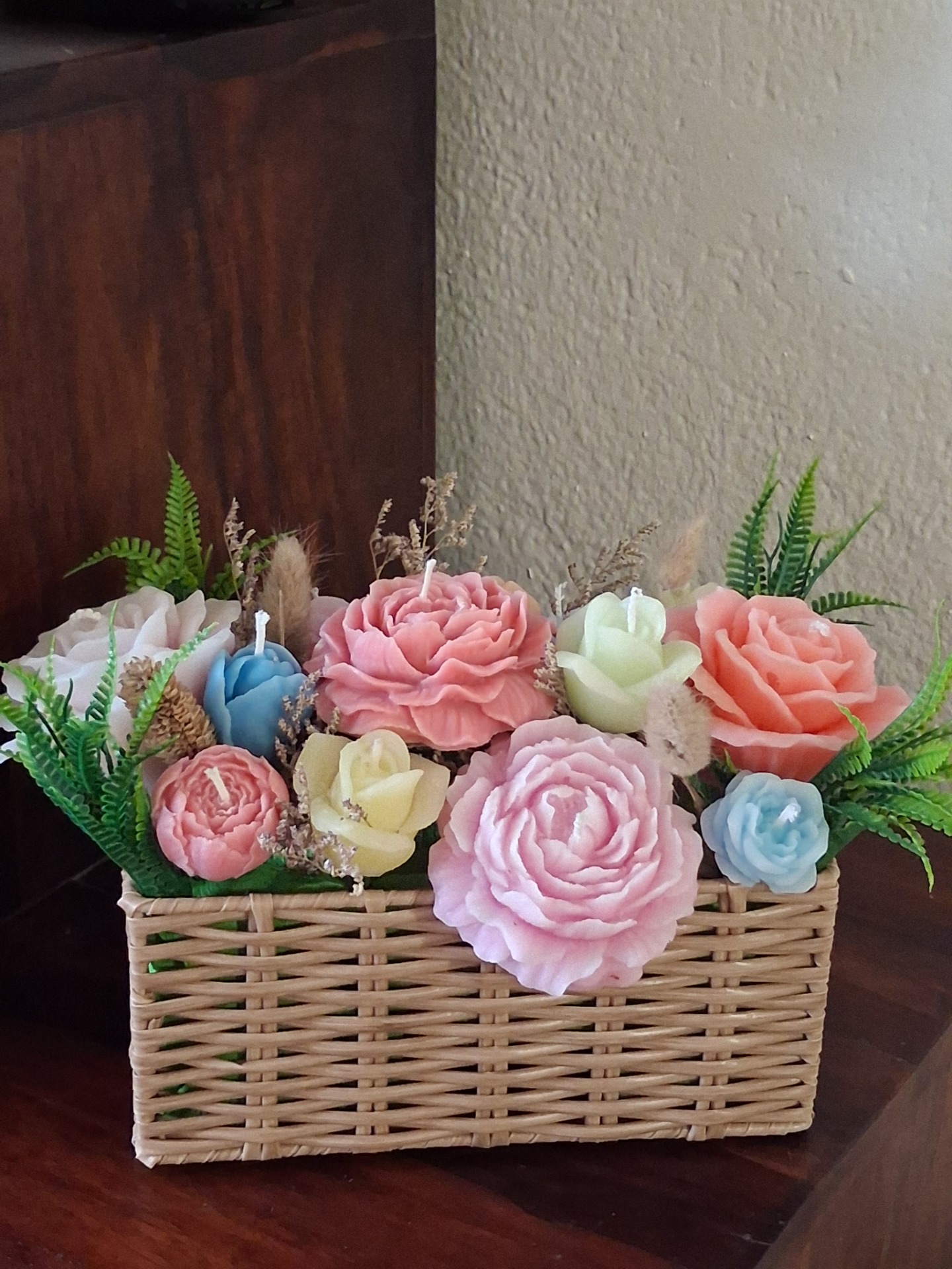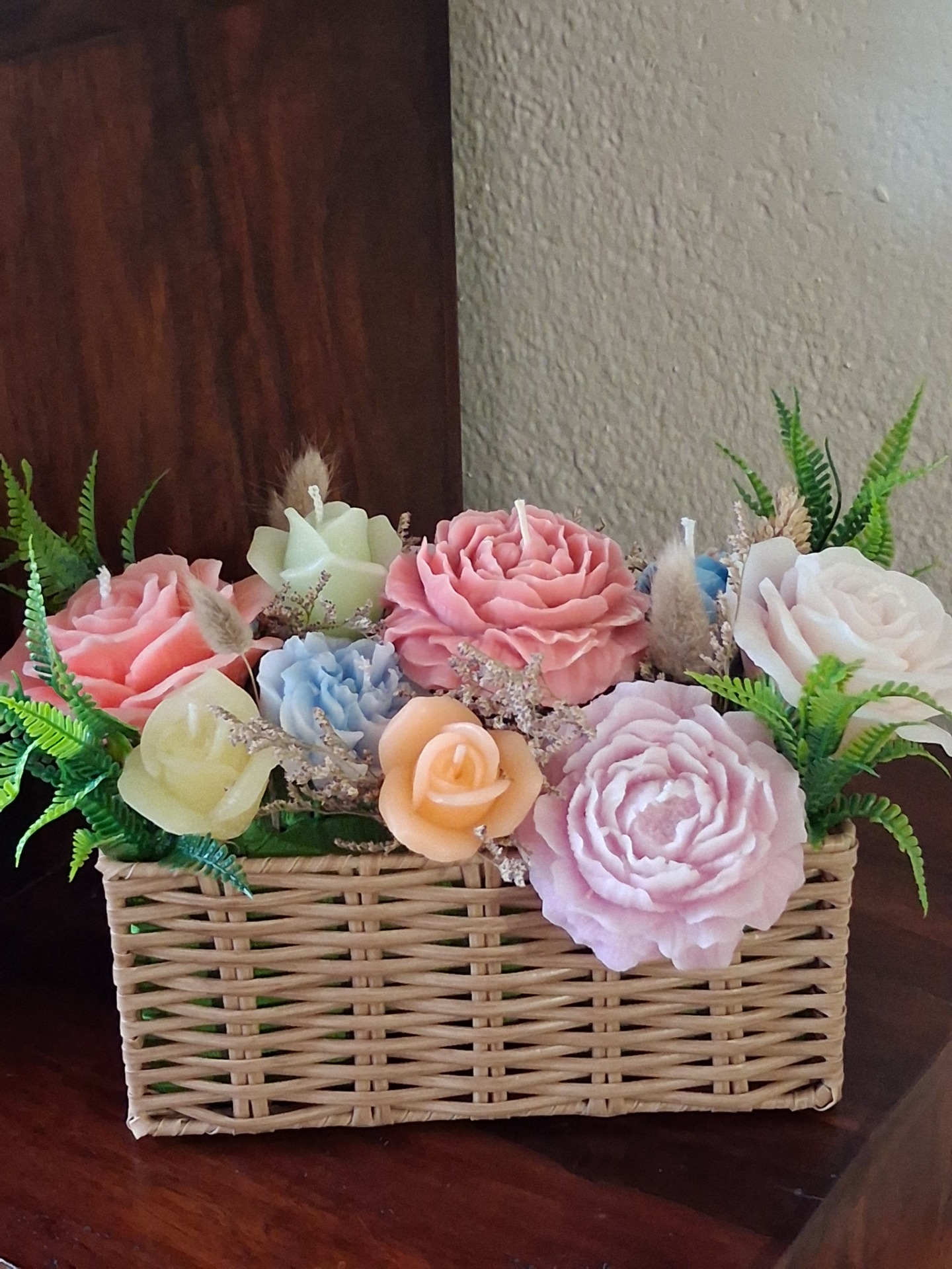 Svíčková kytice . Plnohodnotné svíčky z parafinového vosku k zapálení . Kytice má 14 květů . Košík je plastový , rozměru 20 x 11 x 9 cm . Svíčky jsou navoněné vonnými esencemi .